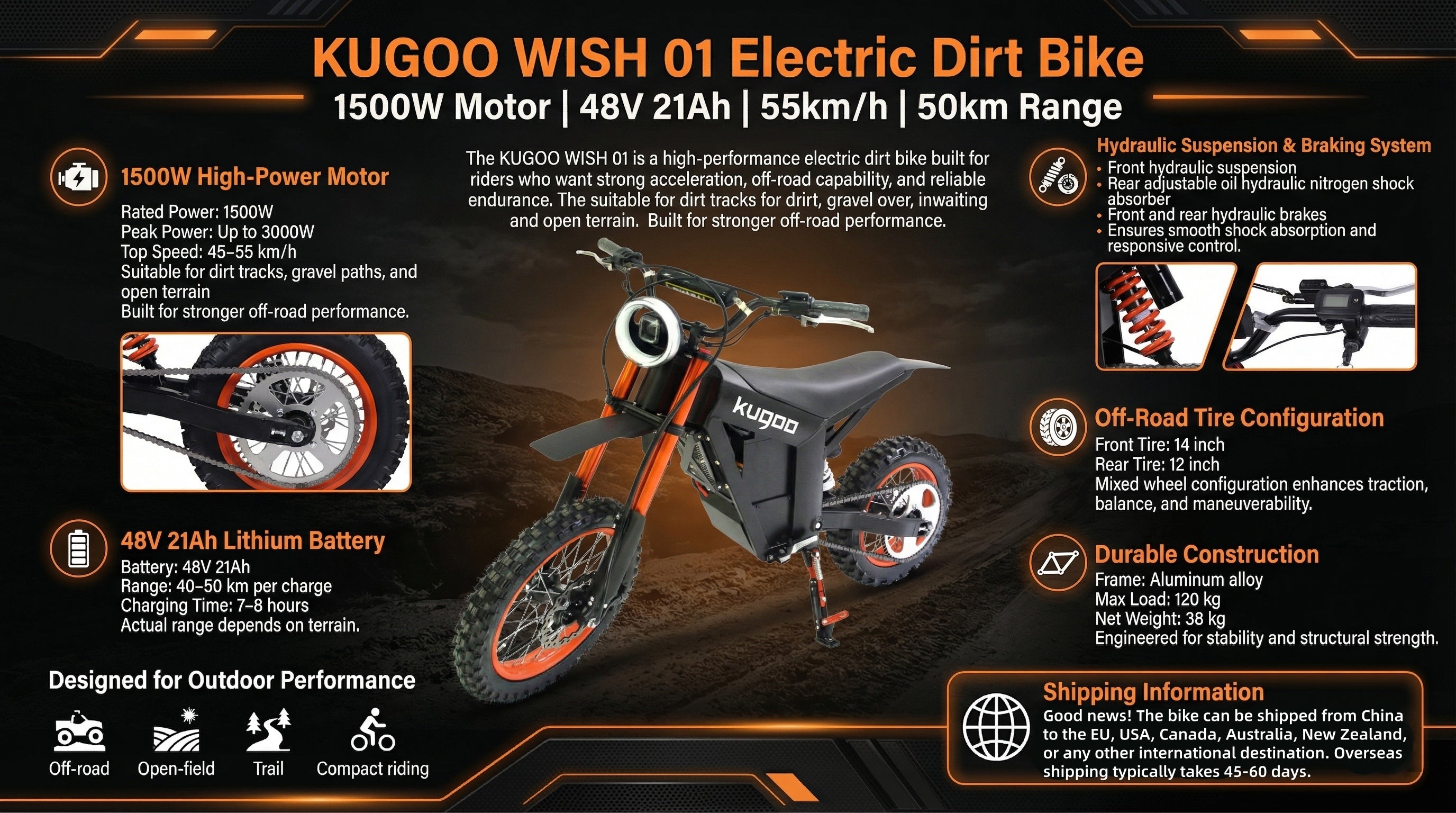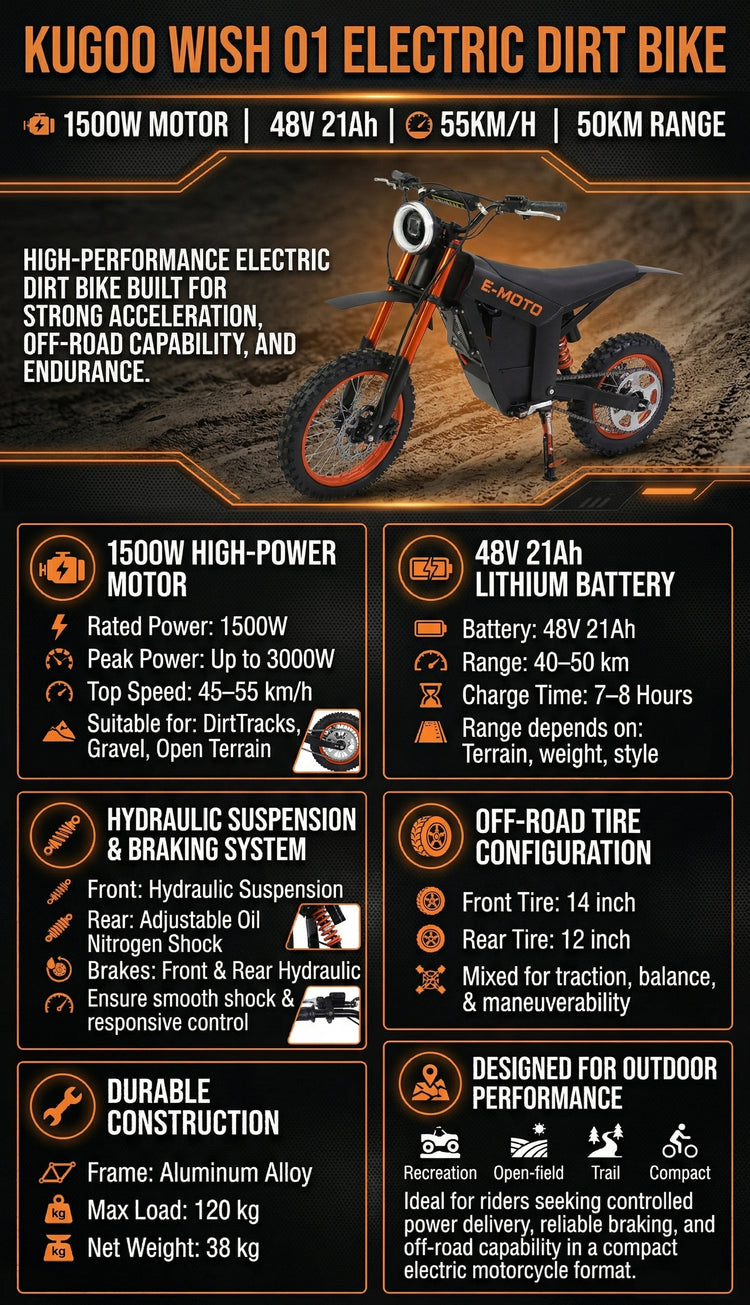 The KUGOO WISH 01 is a high-performance electric dirt bike built for riders who want strong acceleration, off-road capability, and reliable endurance. Powered by a 1500W motor and a 48V 21Ah lithium battery, it delivers dynamic riding performance for outdoor adventure and recreational use.