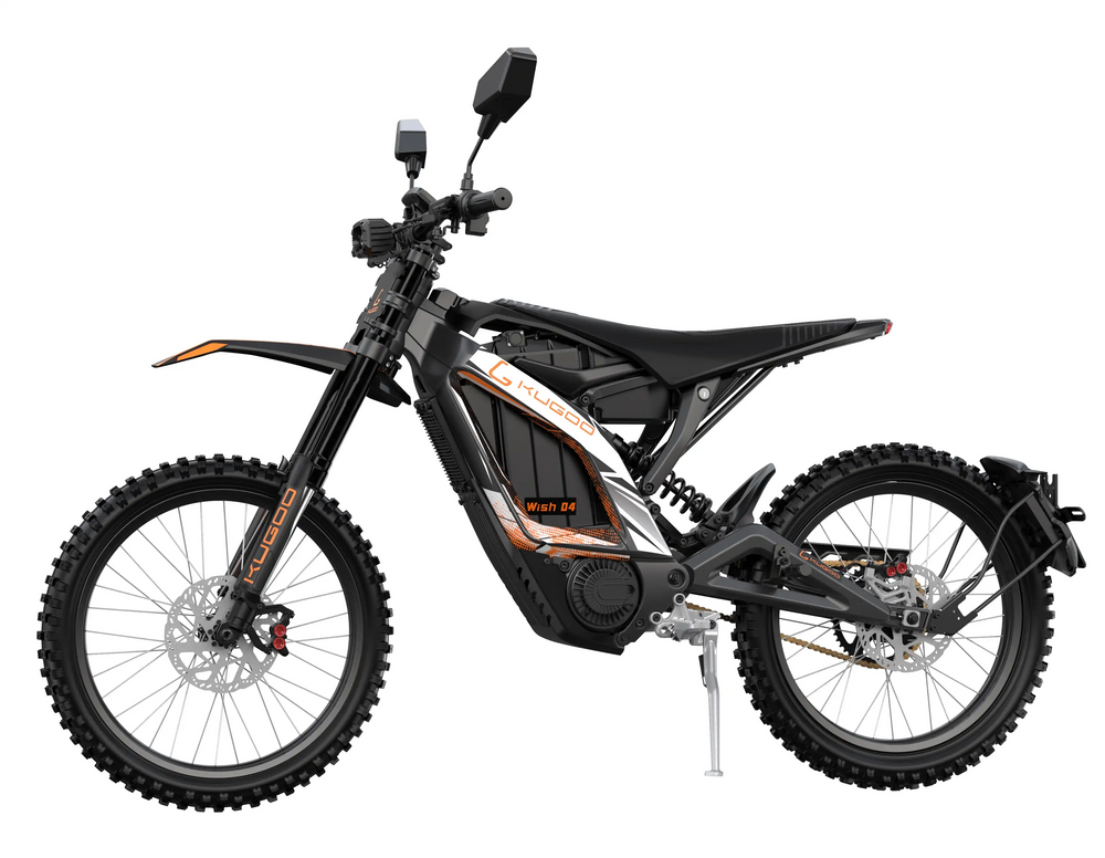 The KUGOO WISH 04 is a full-size high-performance electric dirt bike designed for riders who demand maximum power, speed, and off-road capability. With a 3700W rated motor and 5700W peak output, it delivers strong torque, rapid acceleration, and stable high-speed performance across demanding terrain.